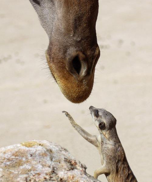 此時,長頸鹿竟低下頭來和狐獴對看,“我從來沒看過這種景象!”阿方索說,原先他沒打算拍攝,因為“我不希望打破這種和諧。”不過,當長頸鹿彎身碰到狐獴的頭,看起來就像狐獴向長頸鹿索吻,甚至還“伸手”摸摸長頸鹿。