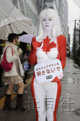 美國動物保護組織的一名加拿大籍女性24日下午全身僅穿一套內衣,在東京赤坂的加駐日大使館前抗議捕獵海豹獲取毛皮。(圖:共同社)