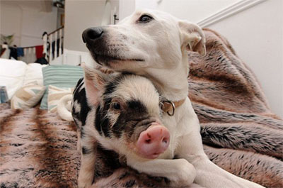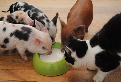 克羅夫特家的寵物“長老”是狗狗黛西和貓咪海克托,這一狗一貓都不是吝嗇的小動物,它們愿意和迷你豬們分享自己的一切,包括床和食物。因此常常可見小豬們和貓咪躺在一起睡覺、一起喝牛奶;或是看到小豬黏在狗兒黛西身上,相互依偎。有時候好幾只豬集體霸占黛西的睡床,它寧愿看著小豬熟睡,自己卻坐得直挺挺地,不敢吵醒它們。