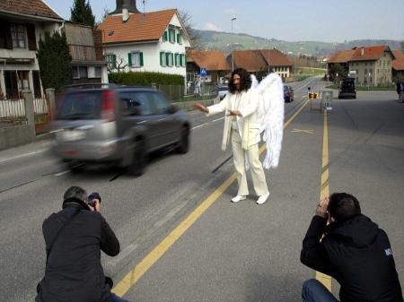 為了防止民眾在道路上開快車,瑞典警方雇用一個演員扮演“白衣天使”,讓他勸民眾開慢點。