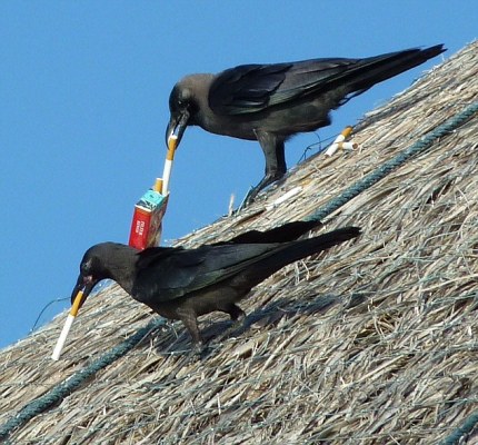 令人詫異的是,這只烏鴉頗為熟練的從煙盒中叼出一根香煙,站在屋頂的一角細細“品味”,狀態十分滑稽。而它的一只同伴見狀也做出了幾乎同樣的行動。