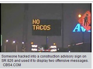 公路旁的電子廣告牌,應該是提供交通信息,但邁阿密這條公路旁的廣告牌,卻出現了“不要拉美人士”、“不要玉米餅”的字樣,原來是這個廣告牌遭到黑客入侵,惡意竄改了顯示的的字樣。