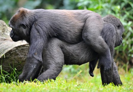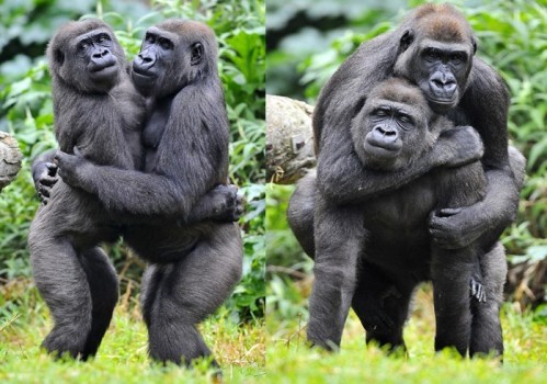 兩只猩猩初次見面,喬哈里便同意讓姆貝基倒騎在它的背上。隨后,它們互相更換位置。再然后,兩只猩猩好像以跳舞的站姿站立,“熱情”地互相擁抱,看上去十分友好。