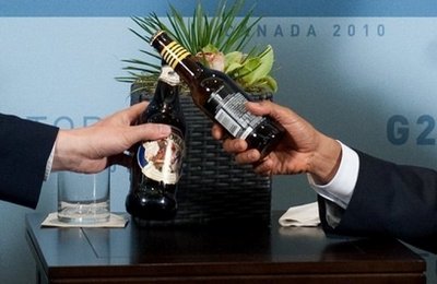 今年初,奧巴馬也曾與加拿大總理哈珀為溫哥華奧運美加兩國冰棍球決賽打賭,結果美國隊輸球,奧巴馬履行承諾,運了一箱美國啤酒給哈珀。