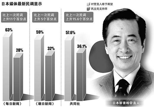 如果說去年9月民主黨實現(xiàn)政權(quán)更迭是日本政治的歷史性轉(zhuǎn)折,那么今年6月民主黨再次組閣則是擺脫該黨頹勢的重要轉(zhuǎn)折。近日,日本多個民調(diào)顯示,民主黨的支持率正迅速大幅回升。
