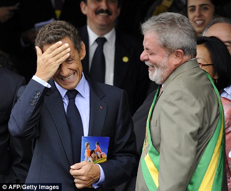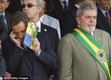 法國總統(tǒng)薩科齊6日至7日對巴西進(jìn)行國事訪問,并應(yīng)邀出席了巴西獨(dú)立節(jié)的慶祝及閱兵活動。閱兵活動中,薩科齊偷接電話被媒體逮了個正著。試圖用宣傳單擋住自己在打電話的舉動,可謂是“欲蓋彌彰”。