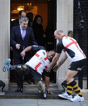 中新網2月3日電 英國首相布朗前日邀請橄欖球隊球員到唐寧街首相府,宣傳本年4月底一場為受傷英兵籌款的慈善賽。