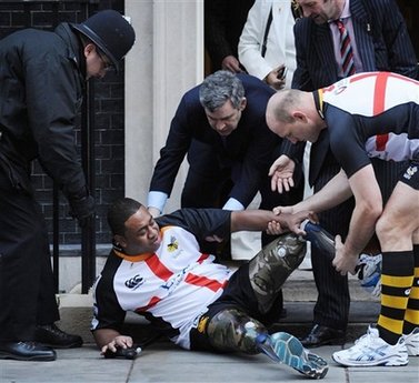 據香港《文匯報》報道,其中一名雙腿殘廢、靠義肢行動的球員,被首相府門外的石階絆倒,跌坐地上。眼不明但手快的布朗及時伸出援手。