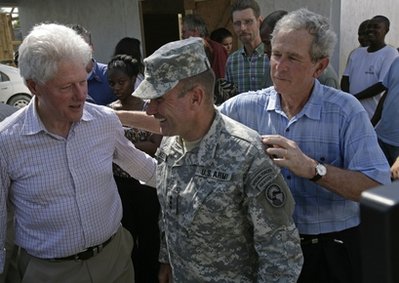 這兩位前總統是于本周一到海地進行人道訪問,視察當地1月12日大地震后的災情。兩人特地到首都太子港探訪災民,當經過頹垣敗瓦的廢墟時,不約而同和居于臨時帳篷的災民握手。