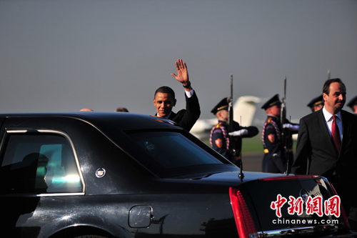 奧巴馬總統于當地時間8日上午9時30分(北京時間8日15時30分)步下降落在布拉格魯濟涅老機場的“空軍一號”專機舷梯。簽字儀式在兩個半小時后舉行。