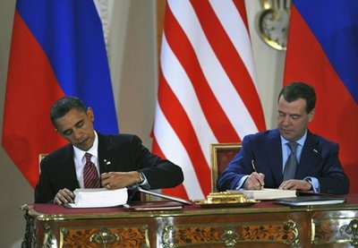 當(dāng)?shù)貢r間8日中午,俄羅斯總統(tǒng)梅德韋杰夫與美國總統(tǒng)奧巴馬在捷克總統(tǒng)府西班牙大廳舉行了隆重的簽約儀式。雙方簽署了俄美削減進攻性戰(zhàn)略武器的新條約。