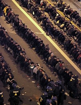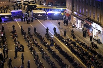 近日來,在哥本哈根舉行的示威活動大部分是和平的,但是在當天的集會中,有數(shù)百名身穿黑衣的年輕人在街上投磚頭,砸窗戶,警方對此進行了干預。防暴警察包圍了鬧事者,要求他們坐在地上,把手放在身后,然后被集體押上警車。