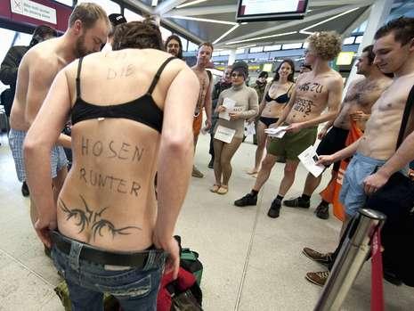 他們身著很少的衣服,一些人還在自己裸露的皮膚上寫著:誰來保護我們的隱私?他們還在微型博客網站Twitter上寫道:“你們無需對我們進行安檢了,因為我們已經赤身裸體了!