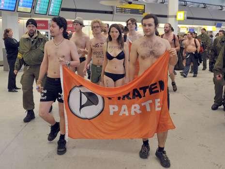 據德國《圖片報》1月10日報道,當地時間周日下午,德國“海盜黨”(一個宣傳保護個人隱私的小黨派)的約15名成員在柏林機場A航站樓半裸抗議政府引進更為嚴格的機場身體掃描設備。