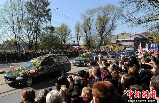 當天早些時候,卡欽斯基夫婦的遺體由軍方飛機從首都華沙運至克拉科夫,葬禮結束后,夫婦二人的遺體將被運往當地有著上千年歷史的瓦維爾宮安葬。