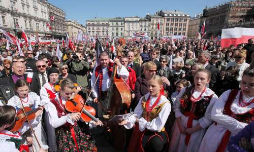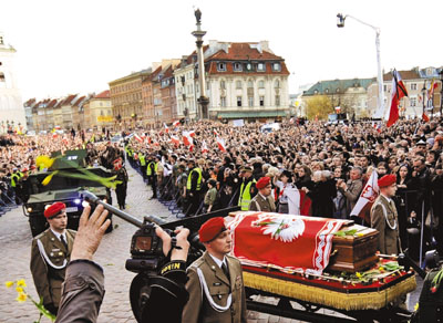 當(dāng)靈車緩慢穿過克拉科夫狹窄街道時,哀悼者為卡欽斯基夫婦鼓掌、拋花和揮舞波蘭國旗。卡欽斯基夫婦的遺體,是用飛機從華沙運抵這里的。