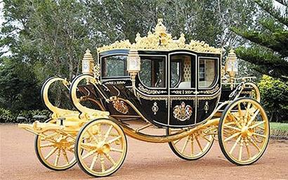 據報道,這輛奢華無比的“黃金婚車”名叫“不列顛尼婭(Brittania)”,由澳洲工匠弗萊.克林頓耗時6年打造。克林頓此前為英國女王伊麗莎白二世制造過多輛專屬馬車。這輛奢華的“黃金婚車”全車重達2.5噸,高3米,車身上裝飾有總計24顆鉆石、130顆藍寶石和超過400片金葉。車身上一百多塊木材分別取自倫敦塔、19世紀英國海軍名將納爾遜的“勝利號”戰艦以及16世紀亨利八世國王的“瑪麗.羅斯號”戰艦等重要王室建筑和文物,將是迄今為止英國最具有歷史意義的車輛之一。