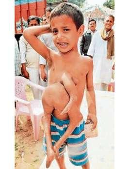 據(jù)德國(guó)《圖片報(bào)》2月19日?qǐng)?bào)道,現(xiàn)年8歲的迪帕克·庫(kù)馬爾是一名來(lái)自印度比哈爾邦的小男孩。從一出生,他的外貌就把周?chē)娜梭@得目瞪口呆:他長(zhǎng)著4條腿和3支手臂,在他腹中有個(gè)孿生弟弟和他一起來(lái)到這個(gè)世界上。