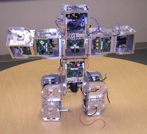 南加州大學(xué)多形態(tài)機(jī)器人學(xué)實(shí)驗(yàn)室兩年多前開始研發(fā)這款“超級(jí)機(jī)械人”(Superbot)。它是由一百塊模塊組成,目前僅完成了頭二十塊。它雖然不能真的像《變形金剛》電影中的機(jī)械人那樣變成貨車或“F-22”戰(zhàn)斗機(jī),但它的變身能力仍令人咋舌:它可以“長(zhǎng)出”一對(duì)、兩對(duì)或三對(duì)“腿子”,可以像蛇那樣滑行,也可以像毛蟲那樣蠕動(dòng)。其中六塊模塊可以形成履帶,有些組合還可以舞動(dòng)繩子。研究主管沈偉明(音譯)稱:“它要攀爬時(shí)可以長(zhǎng)出腿子,要下山時(shí)則可以變成球狀或者索性滾下去。”與賓夕法尼亞大學(xué)去年展出的模塊機(jī)械人相似,它解體后能夠自我修復(fù)和自我重裝:每個(gè)模塊儼如一個(gè)獨(dú)立的機(jī)械人,而且可以利用紅外線和無線電訊息互相“對(duì)話”;它們又會(huì)一直評(píng)估周遭情況,包括附近有沒有其它模塊,以及它們本身是否需要變成手腳。