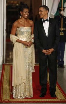 中新網(wǎng)11月25日電 據(jù)美國媒體報(bào)道,美國總統(tǒng)奧巴馬24日晚首次在白宮擺國宴款待外賓,“第一夫人”米歇爾身著華麗晚裝閃亮登場,整個(gè)國宴就像一場炫目的晚會。