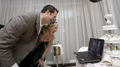 眼看婚禮要泡湯,兩人靈機(jī)一動(dòng),決定通過網(wǎng)絡(luò)向倫敦的親友們直播婚禮儀式。機(jī)場(chǎng)酒店人員獲悉后不但借給他們安裝了Skype聊天工具的電腦,而且還將酒店進(jìn)行了一番裝飾布置,并定做了一個(gè)三層結(jié)婚蛋糕。