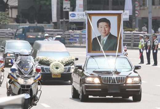 當(dāng)?shù)貢r(shí)間29日凌晨5時(shí),盧武鉉的出殯儀式結(jié)束后,靈車(chē)6時(shí)許離開(kāi)慶尚南道金海市進(jìn)泳邑峰下村,4小時(shí)50分鐘后來(lái)到首爾。