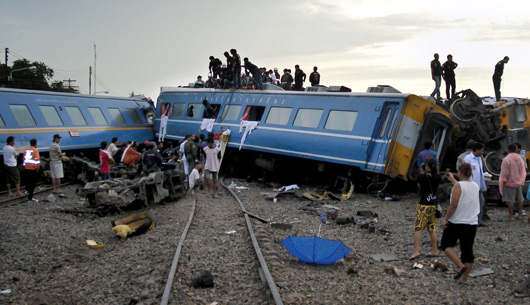這列火車從泰國(guó)南部Trang省開(kāi)往曼谷,在距離海邊度假地Hua Hin南部13公里處脫軌。據(jù)警方介紹,有7人當(dāng)場(chǎng)死亡,另外有45人被送往附近兩個(gè)醫(yī)院。泰國(guó)媒體報(bào)道稱,有100多人受傷。