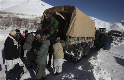 被大雪圍困的阿富汗人9日成功獲救進(jìn)入軍車(chē)。