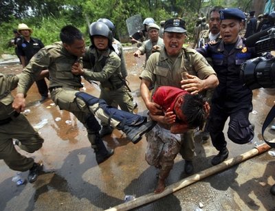 沖突發(fā)生在首都雅加達(dá)北部的丹戎不碌,該市發(fā)言人庫(kù)爾尼亞(Cucu Kurnia)稱,約2000名安保人員與600名警察用催淚彈、橡皮子彈、高壓水槍與警棍驅(qū)散示威民眾,。警方估計(jì)示威民眾約有500人。