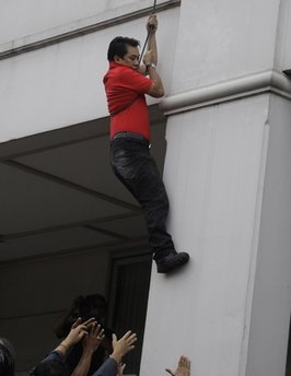 紅衫軍領(lǐng)導人阿里斯曼(Arisman Pongruanrong)通過繩梯從位于曼谷市中心的這家酒店爬下,在等候的紅衫軍民眾的幫助下,進入一輛車中然后迅速離開。另外一名紅衫軍領(lǐng)導人從酒店窗戶爬出并順著一棵樹滑下,也成功逃離現(xiàn)場。