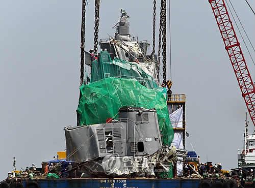 中新網(wǎng)4月24日電 據(jù)韓聯(lián)社報(bào)道,韓國海軍“天安艦”艦首24日上午將被吊至駁船上。