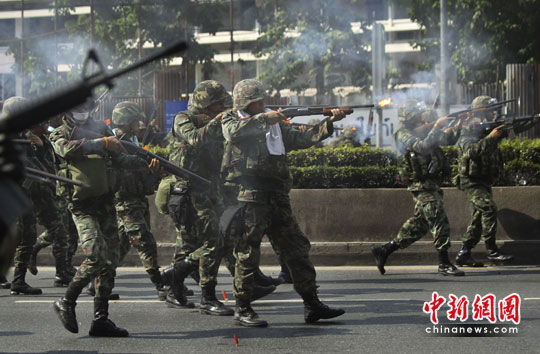 中新社曼谷5月15日電(記者 余顯倫)15日清晨至晚,泰軍隊和示威者之間的對抗和沖突還在繼續。從當天清晨開始,拉差帕宋地區不時傳來槍聲和手榴彈爆炸聲。據此間媒體報道,示威者焚燒輪胎以對付軍隊向抗議現場的步步緊迫。