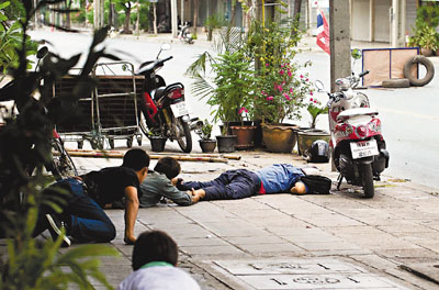 軍隊(duì)包圍“紅色戰(zhàn)區(qū)”,四周不時(shí)傳出槍聲和爆炸聲,軍方加強(qiáng)搜查武器和繼續(xù)“有出無入”的策略。政府發(fā)言人說,前晚主陣地的示威人數(shù)減至6000,證明封鎖策略有效,相信老人和小童已撤走。