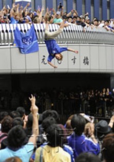 報道稱,大批身著日本隊藍色隊服的球迷涌上街頭占據了十字路口,甚至還有球迷跳入河中用這種奇特的方式慶祝勝利。比賽結束約20分鐘后,第一名球迷跳入河中,隨后又有50余人高呼萬歲跳進河里,連早有防備的在場警察也無法勸阻。