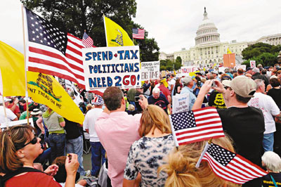 示威者逼爆賓夕法尼亞大道,連綿數個街區,齊向國會山莊浩浩蕩蕩前進。他們高舉奧巴馬和美國眾議院議長佩洛西的肖像,以及寫滿“不要更多的開支,不要更多的稅收,不要更多的謊言”、“支持奧巴馬的醫療改革方案等于自殺”等各種各樣的標語。