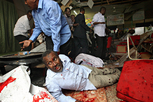 根據(jù)索馬里過渡政府通報的情況,在典禮過半之時,一名男扮女裝的“人彈”站起來徑直走到主席臺前,引爆了綁在身上的炸彈,現(xiàn)場隨即變成一片“血海”。索馬里過渡政府衛(wèi)生部長、教育部長、高等教育部長及文化部長當(dāng)場身亡,體育部長身受重傷,其他死傷人員包括參加畢業(yè)典禮的大學(xué)生、教職人員、學(xué)生家長及當(dāng)?shù)孛襟w記者。