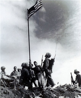 美軍勝利后于1945年2月23日在島上的折缽山上豎立了美國(guó)國(guó)旗。雅各布斯一直堅(jiān)持說(shuō)他就是首次豎立國(guó)旗的照片上那個(gè)背著無(wú)線電報(bào)話機(jī)的通訊員。這張照片是Leatherneck雜志的攝影師拍攝的。