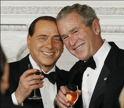 意大利總理貝盧斯科尼14日參加完在巴黎舉行的歐盟國家領導人會議之后,前往華盛頓會見布什。兩人舉止親密,臂挽著臂在白宮草坪散步,仿佛多年老友。當晚,為了紀念“哥侖布發現美洲”和歡迎貝盧斯科尼,布什在白宮設宴招待一些美國和意大利政要。