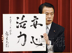 麻生在記者會上展示自己的書法杰作。他說:“我下定決心面對此時的困難時局,對人民的期望作出反應(yīng)。我要保護(hù)人民的生計。財政預(yù)算案是最重要的經(jīng)濟(jì)政策。”