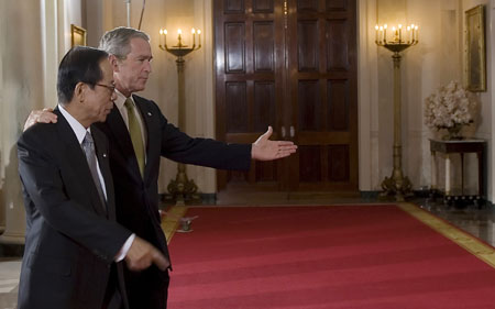 在兩個人都很為難的時候,福田明白,他這次如果再要求布什把“綁架日本人問題”與美朝關系捆綁在一起,就是大大地“不識相了”。布什也是心領神會,只不過面對記者,慷慨激昂地表示了一下“我們不會忘記‘綁架被害者家屬’”,而不作任何實質性承諾。