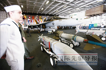 在飛行甲板上,一位名叫馬圭爾的海軍軍官向《國際先驅(qū)導報》記者介紹了艦上的艦載機。從EA-6B“徘徊者”電子戰(zhàn)飛機到E-2C“鷹眼”空中預警機,從SH-60“海鷹”直升機到F/A-18“大黃蜂”的各種改進型,他如數(shù)家珍。