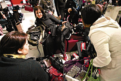 在伯明翰一購(gòu)物中心,3位顧客在爭(zhēng)奪減價(jià)名牌手袋。