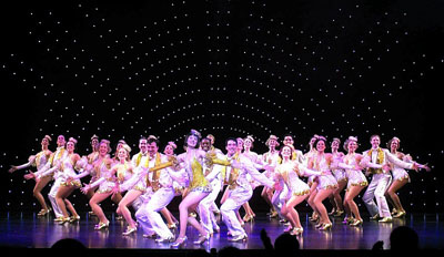 《42街》精妙絕倫的踢踏舞是觀眾最值得期待的表演。不同于傳統(tǒng)愛爾蘭踢踏舞的嚴(yán)肅、西班牙佛朗朗哥古典芭蕾的優(yōu)柔和現(xiàn)代舞的活力與動感,《42街》以輕盈、歡快的美國踢踏舞為主,每一幕都可以看到眾多舞姿精湛的踢踏舞演員和著節(jié)拍輕踏雙腳。在節(jié)奏強(qiáng)勁的音樂聲中,上百只鮮艷的舞鞋在木地板上咔咔作響,聲勢浩大,規(guī)模空前。