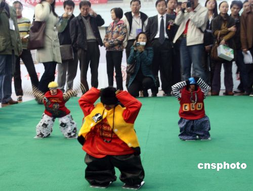圖為重慶大學自行研制的機器人在開幕式上表演舞蹈,吸引觀眾注目。