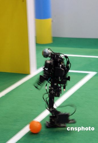 圖為比賽開始前,一個人型機器人正訓練射門。
