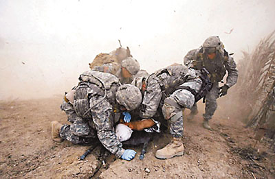 3月時(shí)一名駐伊美軍在戰(zhàn)斗中受傷,其他士兵保護(hù)他免受救援直升機(jī)激起的沙塵傷害。