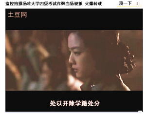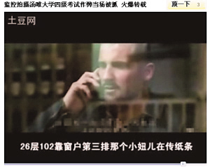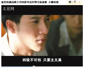 視頻的高潮出現在校方采取的反作弊行動,畫面切換成《無間道1》中黃秋生部署抓琛哥,臺詞卻換成:“這次四級考試,梁校長下令狠抓作弊,所以我們采用高科技無線遠程監考,考試的時候,大家用望遠鏡遠距離瞅著考場,一旦發現作弊的,立馬用手機報告抓捕大隊,一個活口不留!辈⒓尤肼撏◤V告元素。接下來,《越獄》里的林肯“奉命”拿著望遠鏡報告:“26層102窗戶第三排那個小妞在傳紙條。”《新扎師妹》里的方中Sir接獲報告后立馬拿著呼叫器大叫:“好,我們立馬去逮!弊詈,王佳芝和鄺裕民雙手被縛,跪在石礦場上,這時配上校方用無比嚴肅口吻說出的“宣判詞”:“王佳芝等同學作弊,違背了天天學習,好好向上的校訓,現處以開除學籍處分!