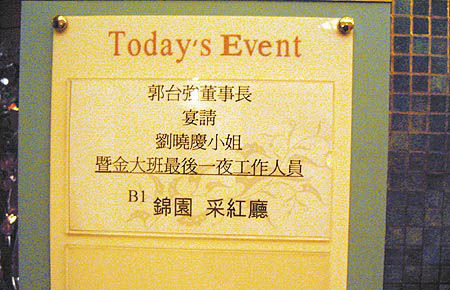 郭臺強宴客消息出現在亞太會館的告示牌上。