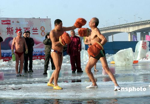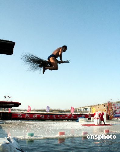 新春佳節,哈爾濱十大名片之一的冬泳表演不斷升級,滑稽性、科學性、專業性,使游人流連忘返。中新社發 姚庭山 攝