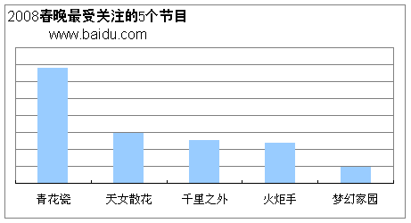 報告指出,在2008春晚節目中,周杰倫演唱的《青花瓷》是毫無疑問的冠軍,而觀眾最為期待出彩的趙本山、宋丹丹小品《火炬手》讓人大跌眼鏡,春節期間網民的關注度僅僅排在第四位。而《天女散花》因章子怡的名氣而以微弱的優勢擊敗了費玉清的《千里之外》,贏得第二名。分析認為,網民的喜好主要代表了年輕人的觀點,作為年輕人的偶像,周杰倫、章子怡等明星出演的節目更受網民青睞。